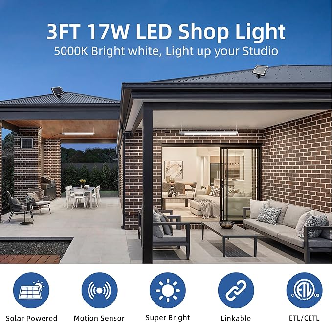 hykolity Solar Powered Shop Light with Motion Sensor, 3FT 17W (100-Watt Equivalent),Integrated LED IP65 Waterproof Outdoor Motion Sensor Shop Light for Garage, Barn, House - 2 Pack