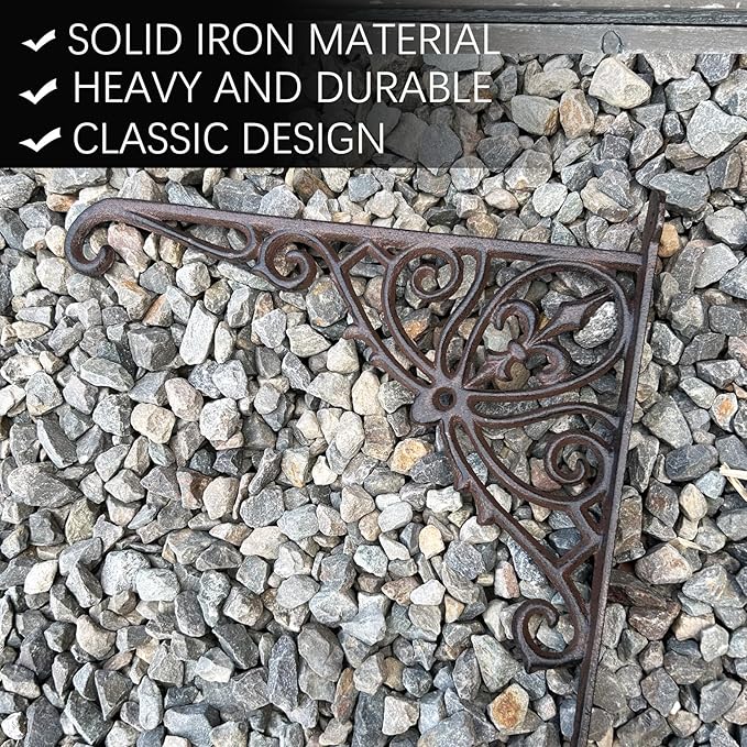 • HEAVY AND CAST IRON MATERIAL: Heavy duty and quality guarantee decorative and functional for hanging flower baskets, pots etc.multi function bracket in brown color rusty looking. Outdoor or indoor usage. Installation screws are included