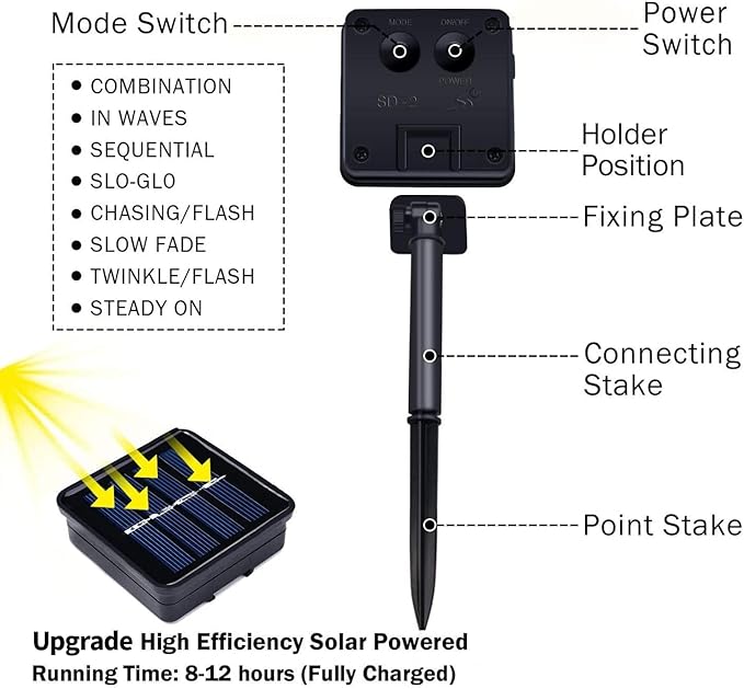 - 【8 Lighting Modes White Solar Lights】 8 modes which include Waves, Combination, Fading, Fireflies, Chasing, Twinkle, Fading slowly, and Steady-on. The solar outdoor Christmas lights will intelligently remember your last choice lighting mode, no need to reset every time.