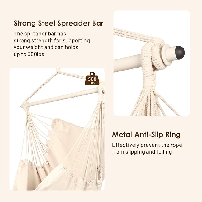 • ▶ SAFE & STRONG - Sturdy Steel Spreader Bar makes the hammock swing more stable, its Anti-Slip Rings can effectively prevent the rope from slipping. It has strong strength for supporting your weight and can holds up to 500lbs.