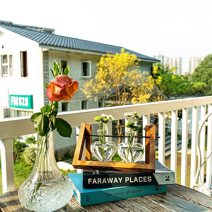 Kingbuy Glass Desktop Planter with Retro Wooden Stand and Plant Terrarium Vase (2 Hearts) for Indoor Home Office Desk Decor Accessories