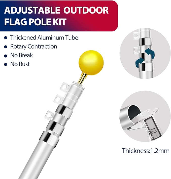- REINFORCED LOCKING SYSTEM- We have upgraded the locking system of the flagpole and lengthened the last ring of the locking system to ensure that the flagpole is locked more firmly. While the twist-lock design ensures an easy installation which allows you finish the installation in minutes, making the flag waving in Christmas, New Year, the National Day, President's Day or any other festivals.