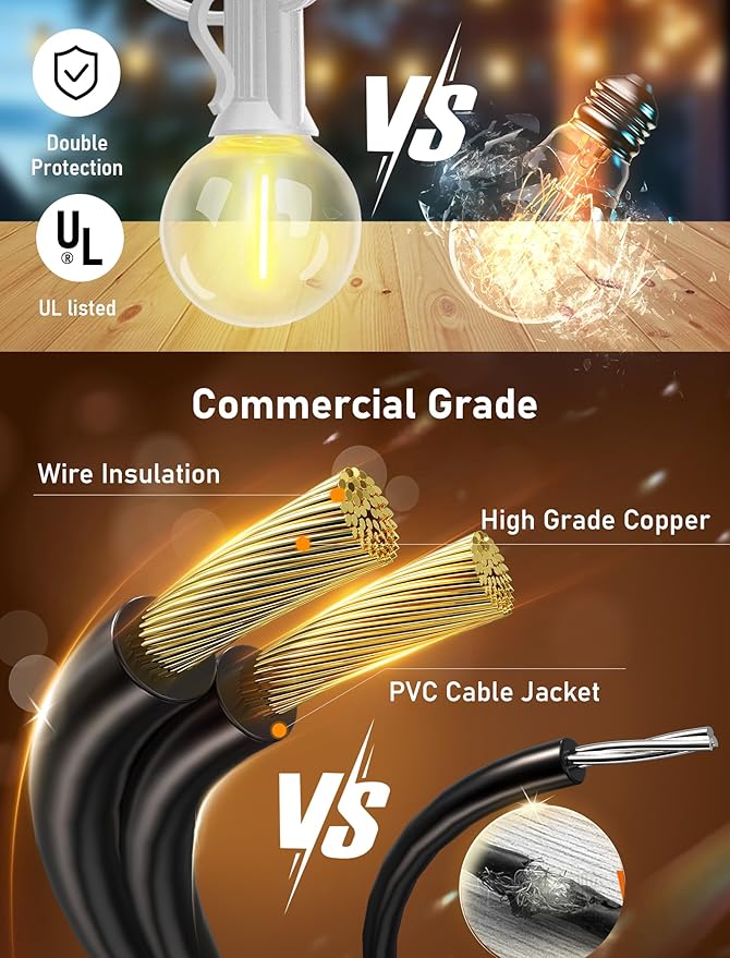 - [Applicable Occasions] G40 backyard string lights can withstand extreme temperatures, rain, wet or wind weather. 2700K warm white lights, more durable than incandescent string lights. Perfect for outside backyard, garden, cafe, deck, bistro, pergola, camping, market , festoon lighting, wedding party, and many other occasions or events.