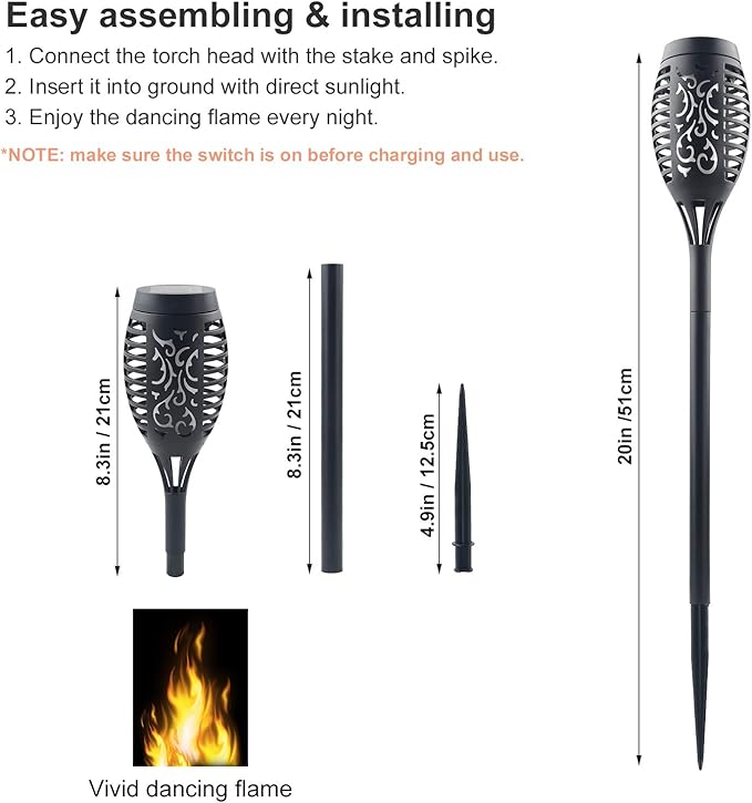 • MAKE YOUR NEIGHBORS JEALOUS: The solar flame lights are a must-have for any gardens that is under the full sun during the day. It is so unique and it will add a special touch for your yard at night and after sunset. Get your solar flame torch lights today.
