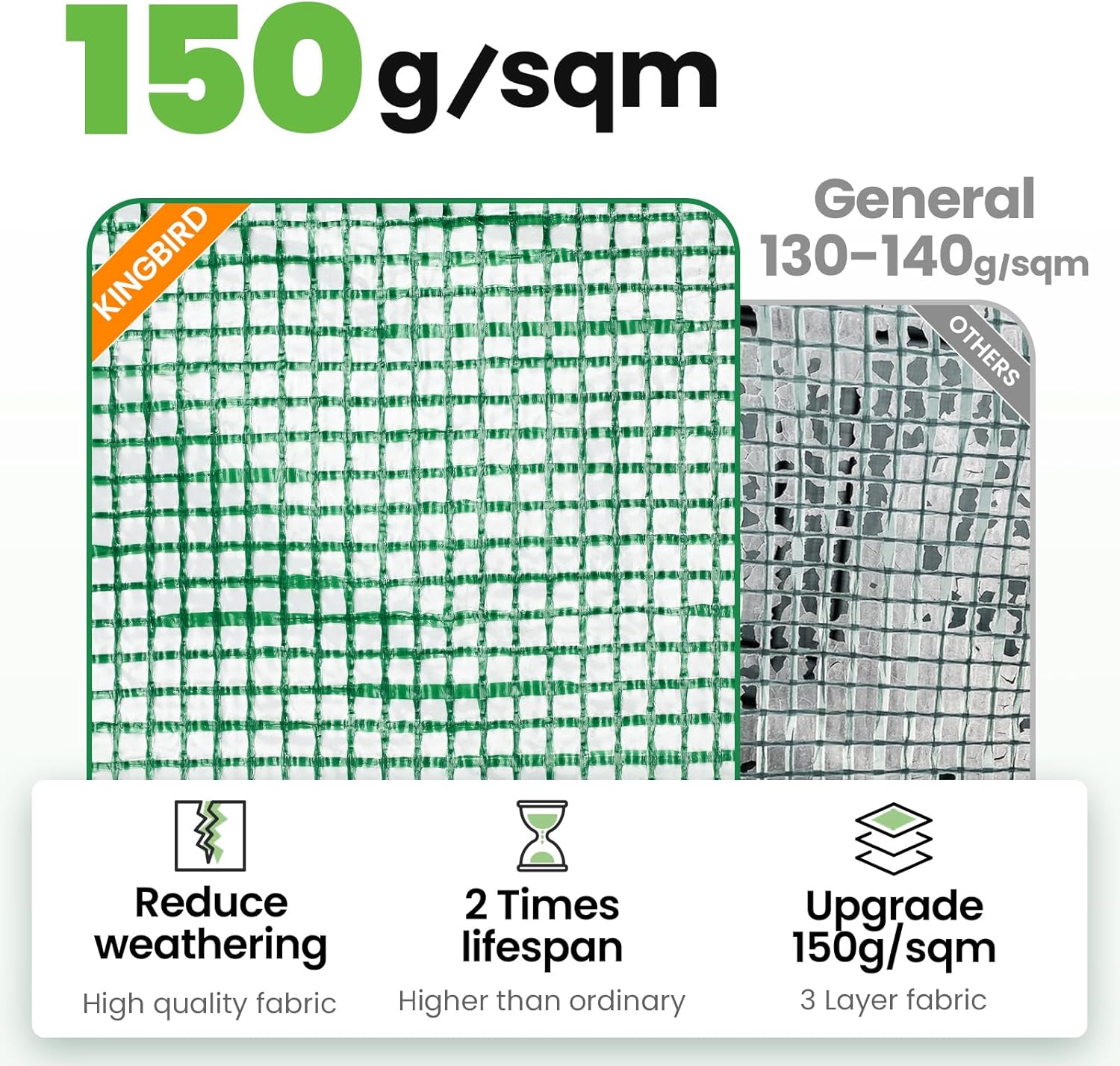 - [UVI 6 Protected Cover]--Waterproof 150g/sqm PE grid cover is UV Index 6 protected, protects your plants from excess rays, which doubles the service life: Compared to other greenhouse(UVI 1-3) that only lasts for 1-6 months, the KING-cover lasts for over years. The reinforced odorless PE covering material provides safe work zone. The cover fits the frame closely, enhancing warmth and wind resistance.