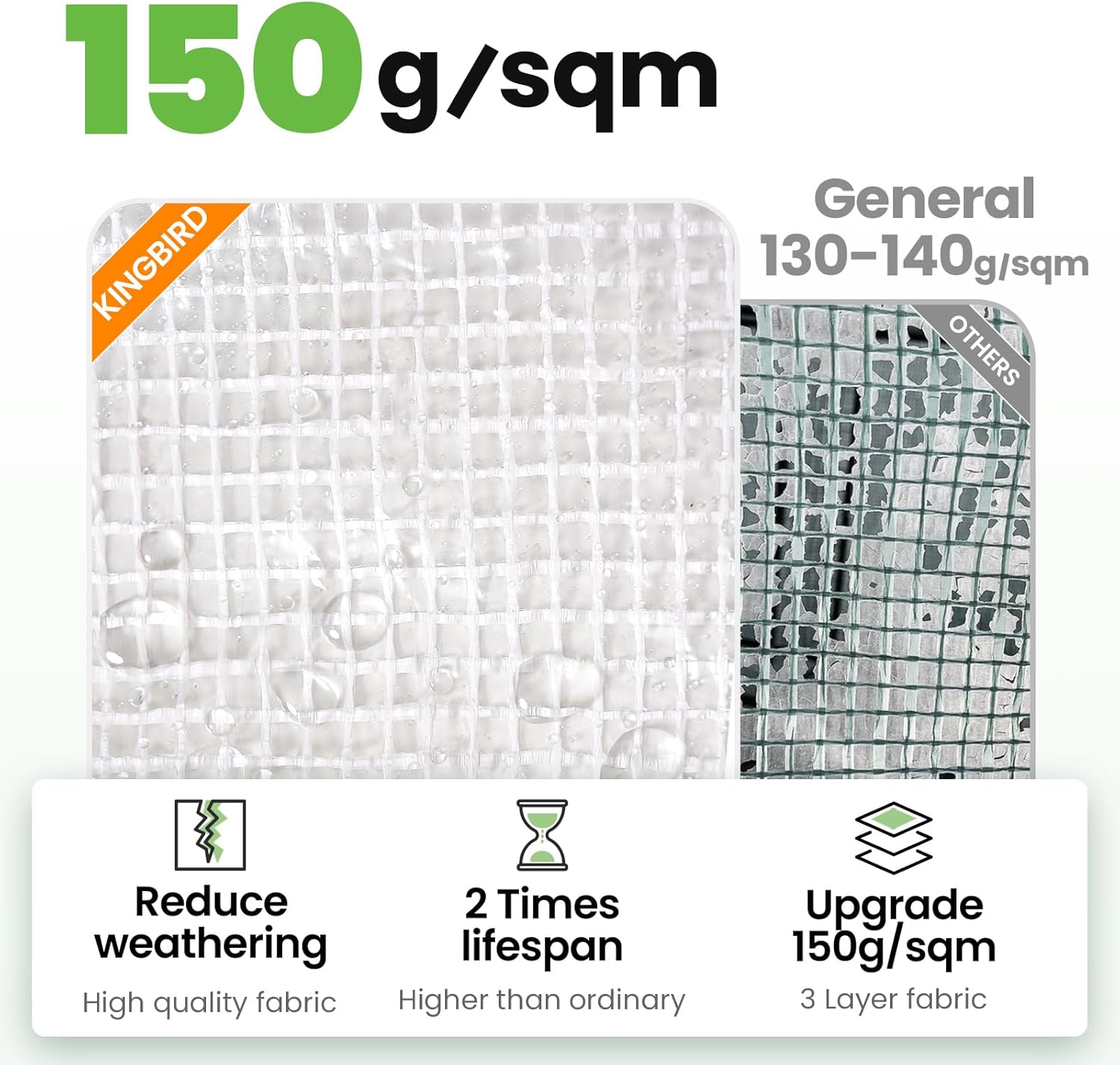 - [UVI 6 Protected Cover]--Waterproof 150g/sqm PE grid cover is UV Index 6 protected, protects your plants from excess rays, which doubles the service life: Compared to other greenhouse(UVI 1-3) that only lasts for 1-6 months, the KING-cover lasts for over years. The reinforced odorless PE covering material provides safe work zone. The cover fits the frame closely, enhancing warmth and wind resistance.
