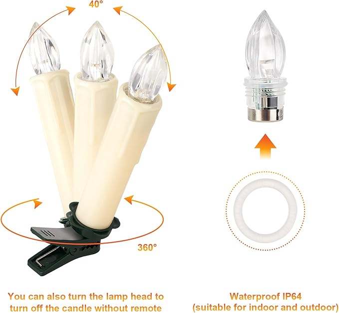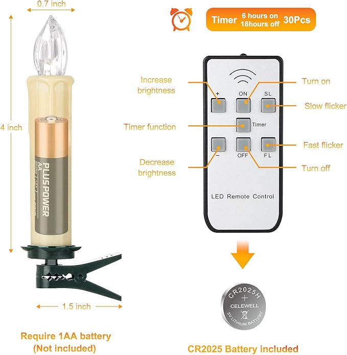 - PACKAGE:30*LED window candles(Batteries not included) , 30*clips,30*waterproof rings, 1*remote control, 1*user manual.Each led taper candle has thoroughly tested, if the flameless tapers has any problem.Please feel free to contact our customer service, we will try our best to help you.