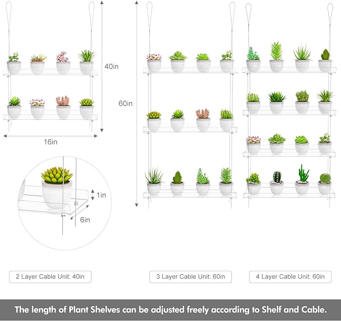 - Adjust Height Freely: Shelves easily adjust to fit a wide range of plant heights.Size:16’’Long, 6" Wide, 1" Deep.2 Layer Cable is 40’’. 3 Layer Cable is 60’’.4 Layer Cable is 60’’.easily adjust the spacing by the turnbuckles to obtain the best fit for windows and plant growth.