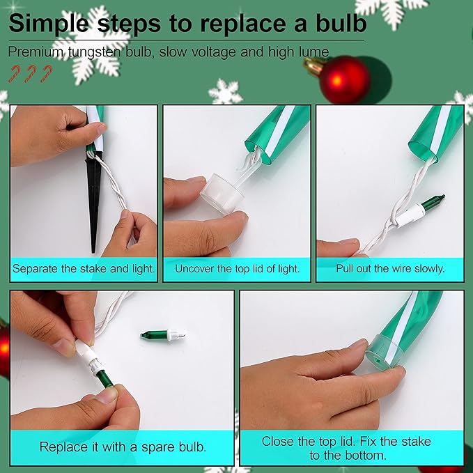 • 【Easy to Install】These Christmas outdoor candy cane lights come with 10 ground stakes. Just insert the stake into the candy cane, then press the stakes into the ground.