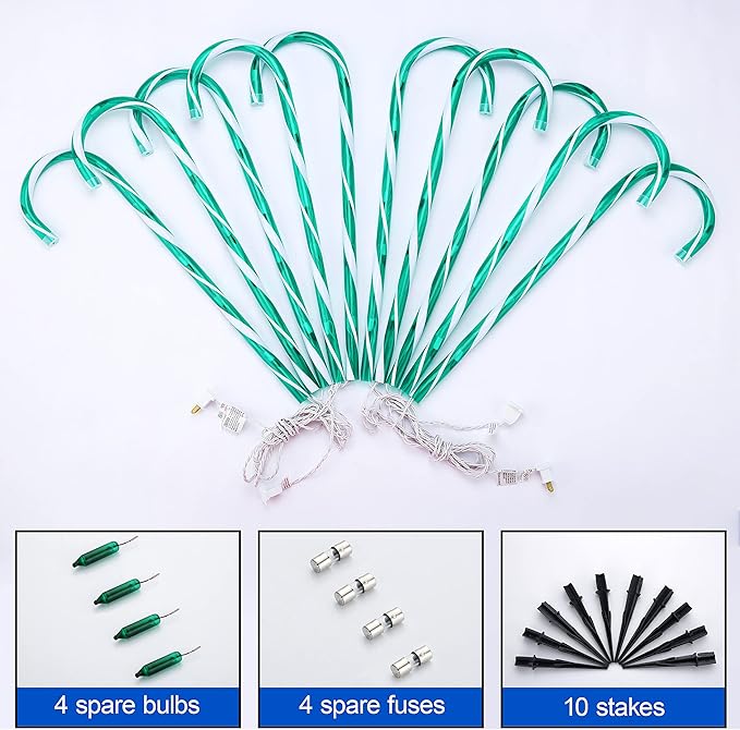 • 【What You Get】You will get a package of 10 pack 26'' candy cane lights, 10 stakes , 4 spare bulbs and 4 fuses. An detailed installation instruction ,finish the DIY installation only takes you a few minutes.