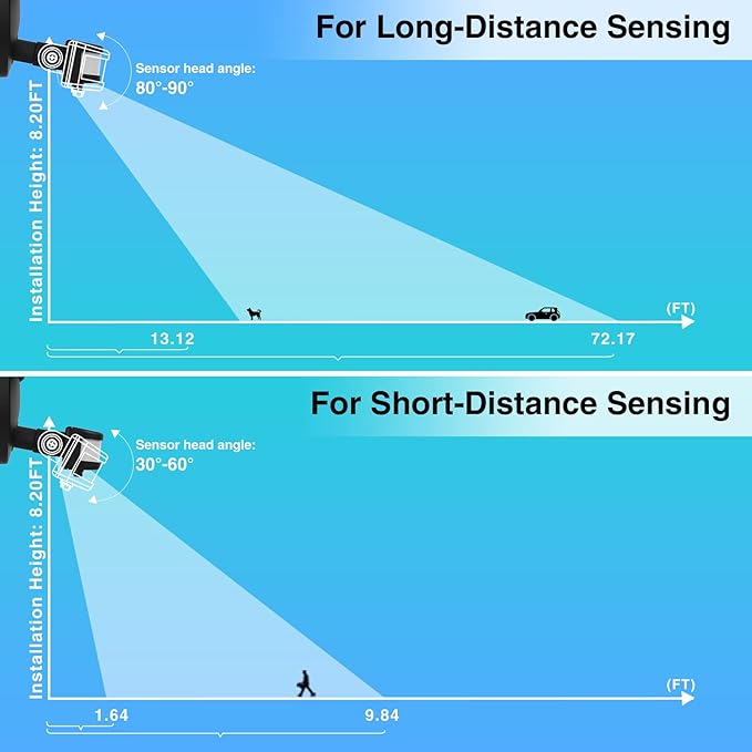 - Adjustable Sensing Mode: You can use the 3 knobs at the back of the sensor to adjust the detection distance, lighting duration and ambient brightness to activate the sensor. Setting the security light to work only at night or both day and night. 180° ultra-wide sensing range, 32.8ft sensing distance and 7~420S continuous illumination time provide you with a larger viewing area for an excellent nighttime experience. Tips: Not Solar Powered