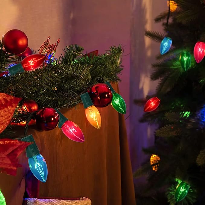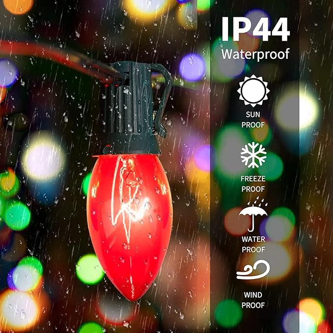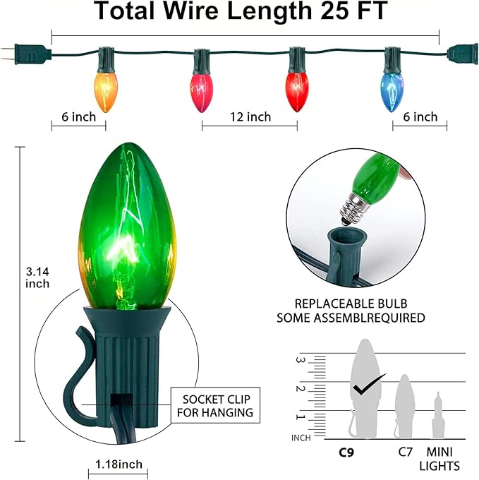 - C9 Incandescent Christmas Lights outdoor: Each C9 bulb consumes just 7 watts, ensuring that your energy bill won't skyrocket during the holiday season. Despite their low energy consumption, christmas lights c9 are incredibly durable, with a bulb life span of 1000 hours. This means you can enjoy their radiant glow year after year without frequent replacements.