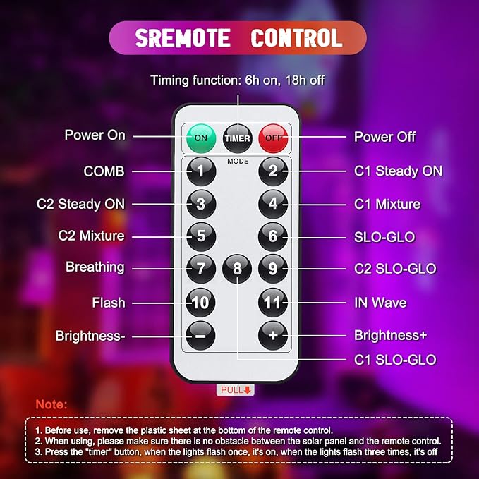 • Convenient Remote Control: Turn lights on/off, adjust brightness, switch modes, and set timing functions from a distance.