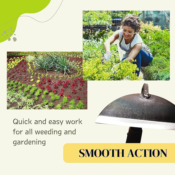 • With its flat blade, it can also be used like a hoe for flatten the soil and gathering weeds which have been cut.