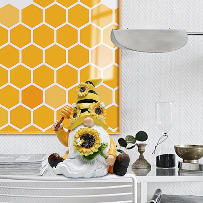 • Honey Bee Farmhouse Decorations: This is a honey bee gnome. The left hand takes a sunflower and the right side takes a faux honey dipper. The sunflower absorbs the bee and make this product so beautiful. It looks like the honey bee gnome is playing. That makes this product so happy. The bee collector and gnomes collector will love them. This funny product will make you happy. It is great addition to your bee themed tiered tray, riser, bookshelf or table decors.