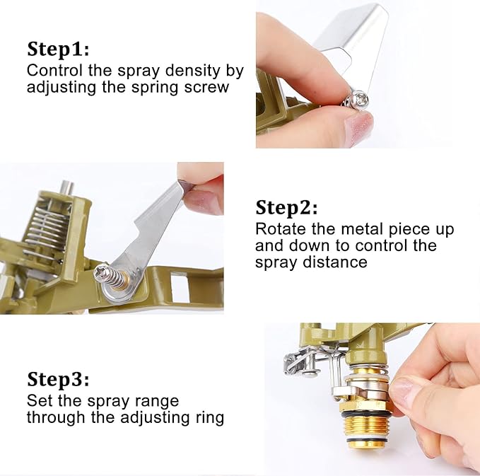 • Free rotation of the sprinkler head around in a 360 degree radius. Adjust the range and arc of the water. Change the spread of water.