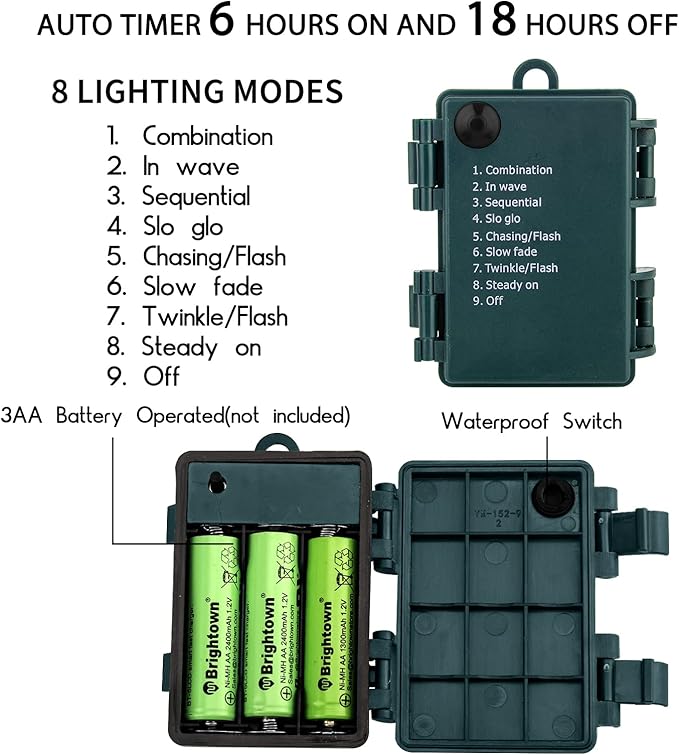 - 8 Lighting Modes: C6 Christmas Lights has 8 different lighting modes, including combination, in wave, sequential, slo glo, chasing/flash, slow fade, twinkle/flash, steady on. Press the button on the battery box to choose your favorite one