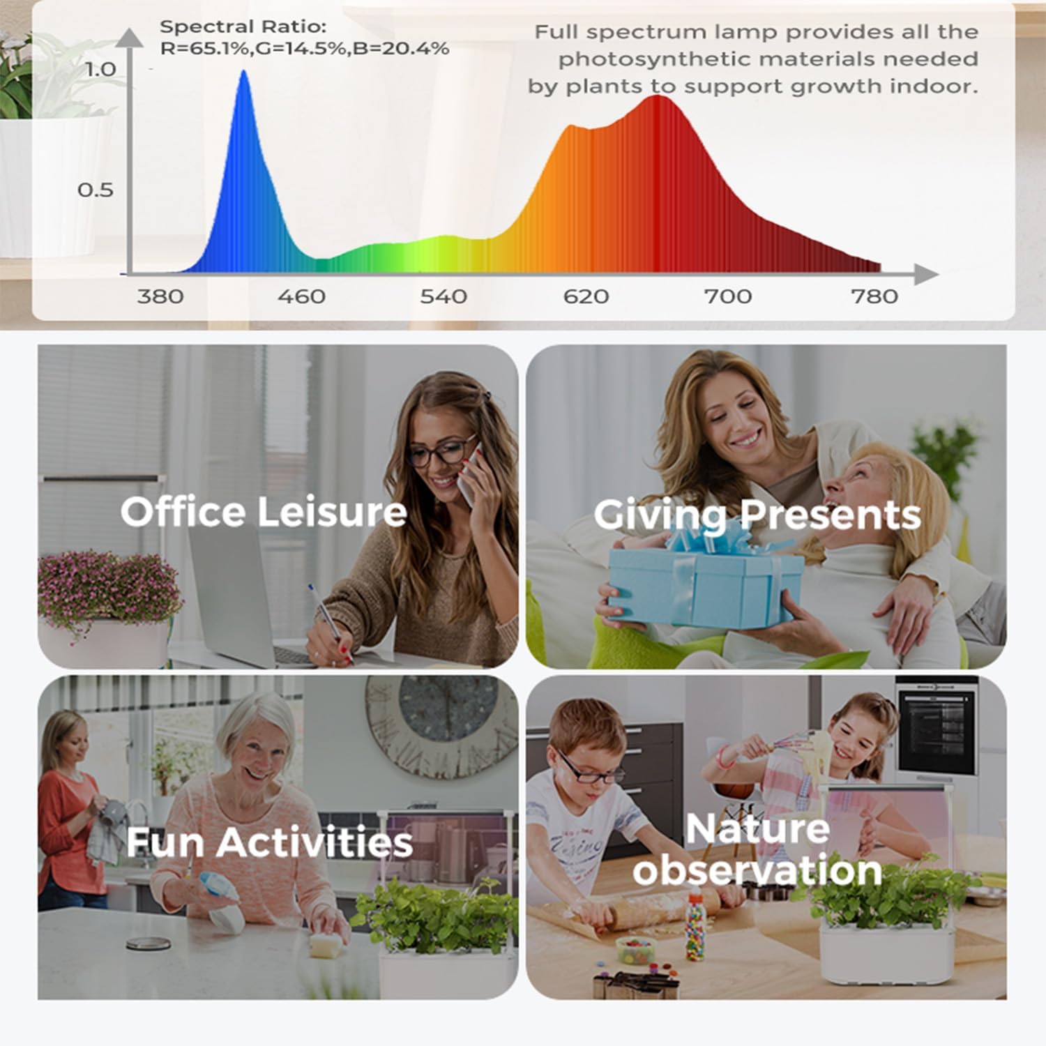 - ใSmart Hydroponic Growing SystemใThis updated indoor garden kit is smarter. Three lighting timer settings for different grow stages:[12h on, 12h off; 16h on, 8h off; 24h on] Two brightness settings [100% & 50%] for different plant lighting requirements. Two self-watering pump modes for different growth stages and temperatures [on 1h, off 3h; 24h on] we advise 24h on when Temp > 30โ or 85ยฐF.