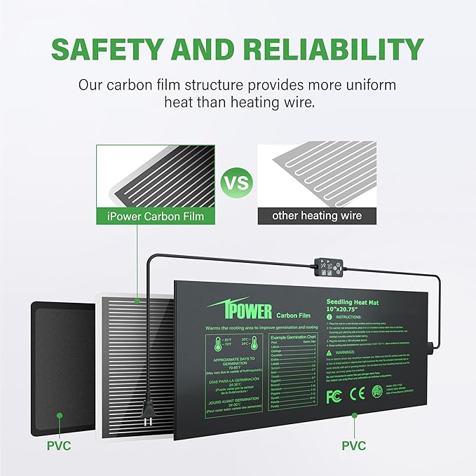 • Heating film structure: heating film ensure uniform heating. Warms root area 10-20℉(5-11℃) over the ambient air temperature, which will increase the success of seedlings and cuttings.