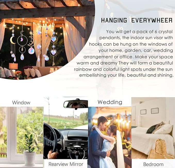 • 🌺Multiple Application: Hang these stunning rainbow sun catchers to your homes, offices, gardens, windows, or used for wedding display, car pendants, or Christmas trees, etc. Suitable for all kinds of occasions, sparking in the sun to create a dreamy atmosphere.