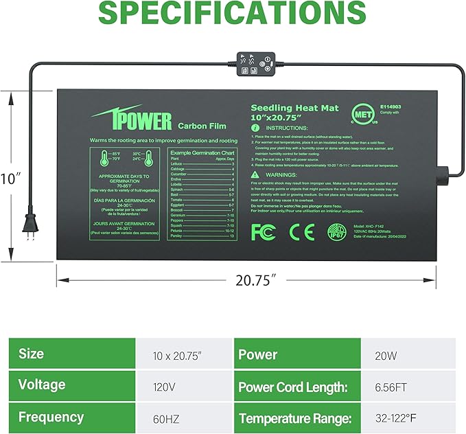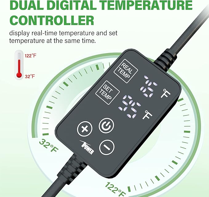 • Dual LED Thermostat: Simultaneously display the real-time and set temperature, which can be adjusted to the required temperature more accurately, a widely range of temperature 32℉~122℉making it the best choice for temperature-sprouting seeds.