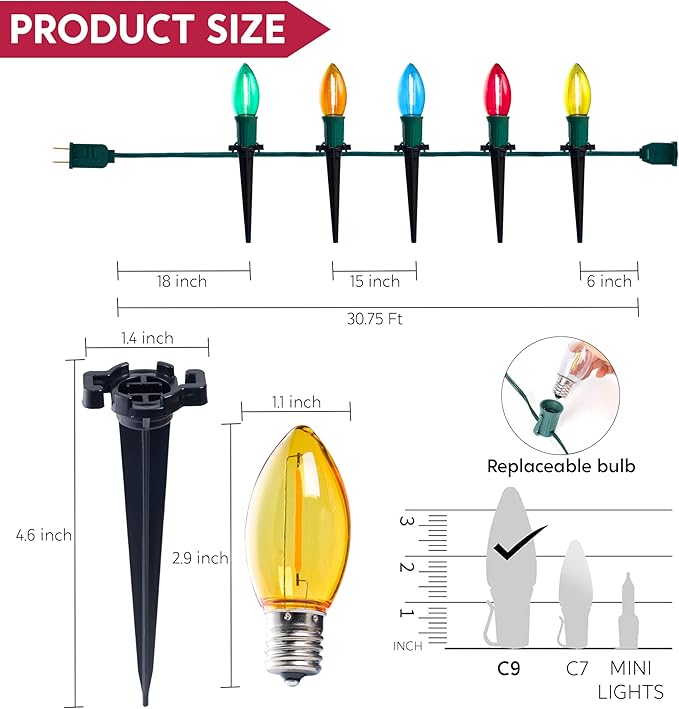- Replaceable, Hangable, Pluggable: Provide 2 spare bulbs to install and replace, a light bulb broken does not affect other lighting bulbs. C9 LED Xmas jumbo bulbs stake lights for indoor and outdoor use for hanging and plugging; Green premium connected cable which could be hung and wrapped around any place to bright up your way.
