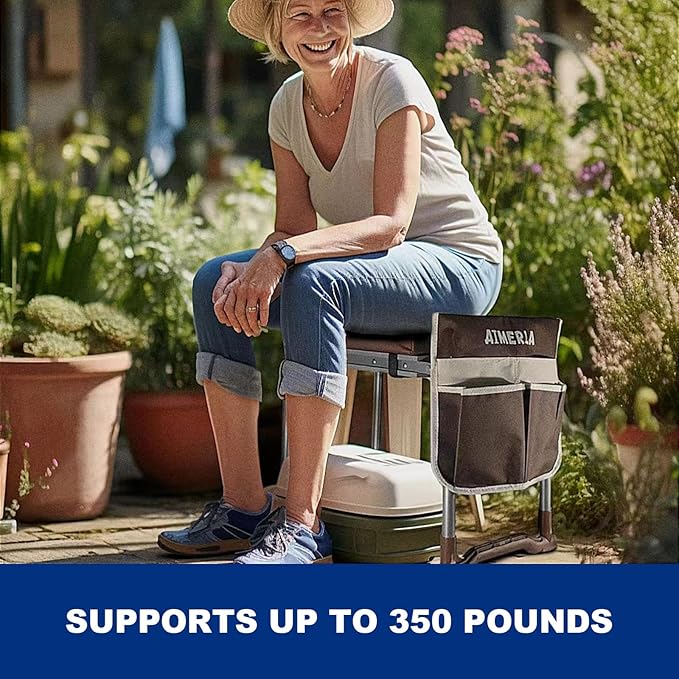 - Unbreakable, Foldable, and Ready-to-Go! Our garden kneeler is as sturdy as your grandma's oak tree swing, supporting up to 350 pounds with ease.. It's ready-to-use, no assembly required โ just unfold, and voilร ! And, guess what? This kneeler is complete with a snap-lock that ensures it stays shut when it's flipped and used as a garden stool. Enjoy grab and go convenience with this garden kneeler that weighs just over 7 lbs. Aimerla Kneeler: making gardening chic and a breeze
