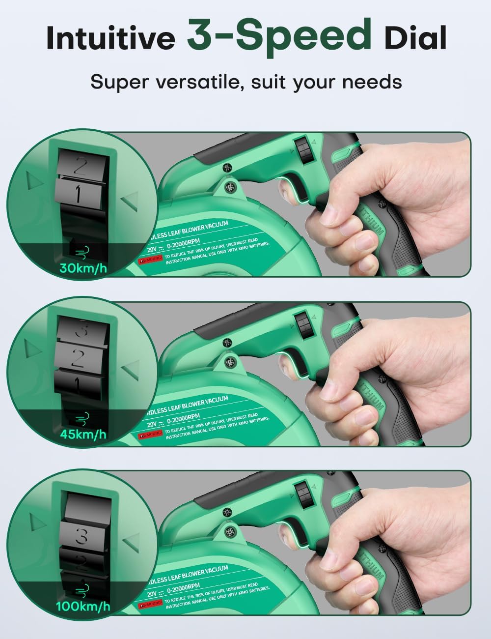 - ๐ใ3 Variable SpeedsใThe cordless leaf blower with 3 variable speeds. Choose between 30km/h for delicate leaf cleaning work, and 45km/h for standard leaf cleaning, or unlock the full power at 100km/h for heavy-duty leaf blowing. Whether you have a small garden or a large lawn, the mini leaf blower is the perfect companion for all your outdoor maintenance needs.