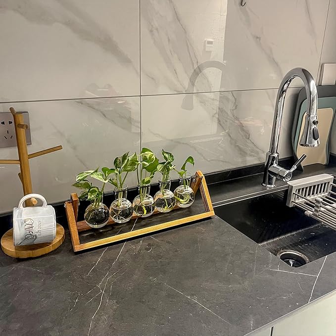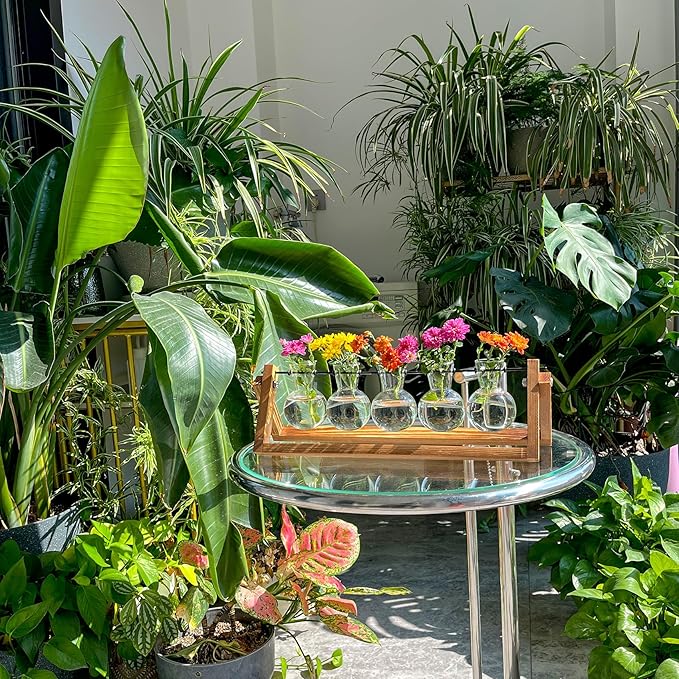 - [Minimalist & Practical Design] - Classic wooden stand and 5 mini bulb-shaped glass vases for stylish display of flowers, plant cuttings and aquatic plants. Suitable for all kinds of green plants and herbs.