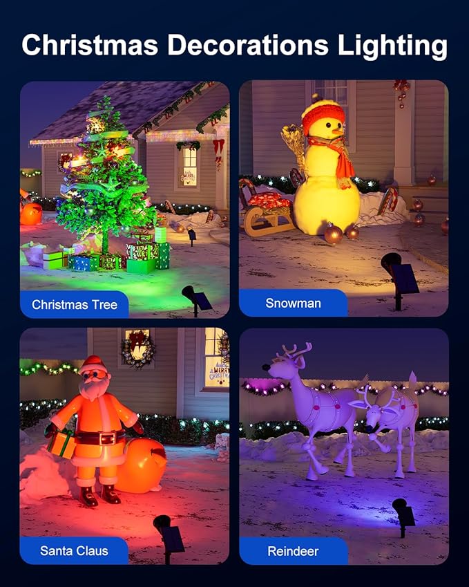 • Personalised Light Color for All Festivals: The color changing solar spot lights are not only suitable for Christmas, but also meet the needs of other festivals such as Halloween, Easter, Independence Day, etc. You can choose the appropriate light colours according to the characteristics of different festivals to create personalised scenes, making your home and yard show unique charm in every festival.