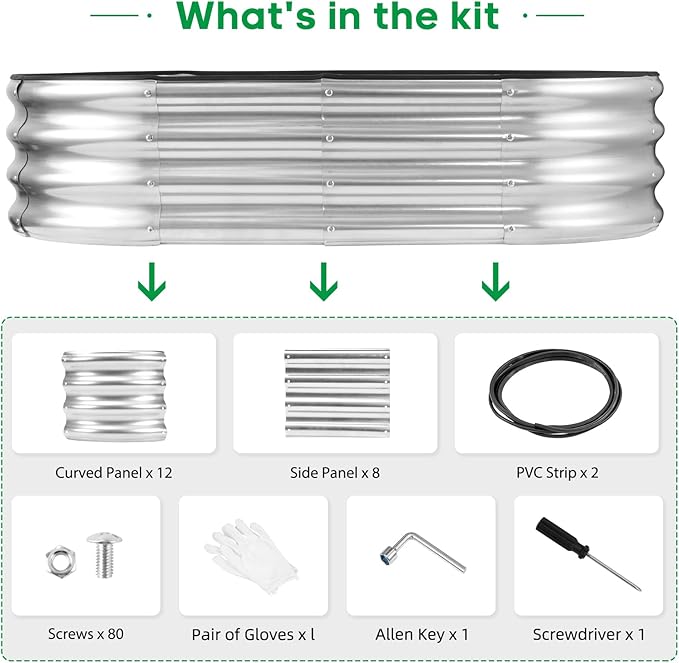 • What You Get: we have included Galvanized raised garden bed kit with detailed assembly instructions, rubber edge strips, safety gloves , wrench tools and with galvanized nuts and bolts in the box .These essential tools elevate your overall planting and gardening adventure.