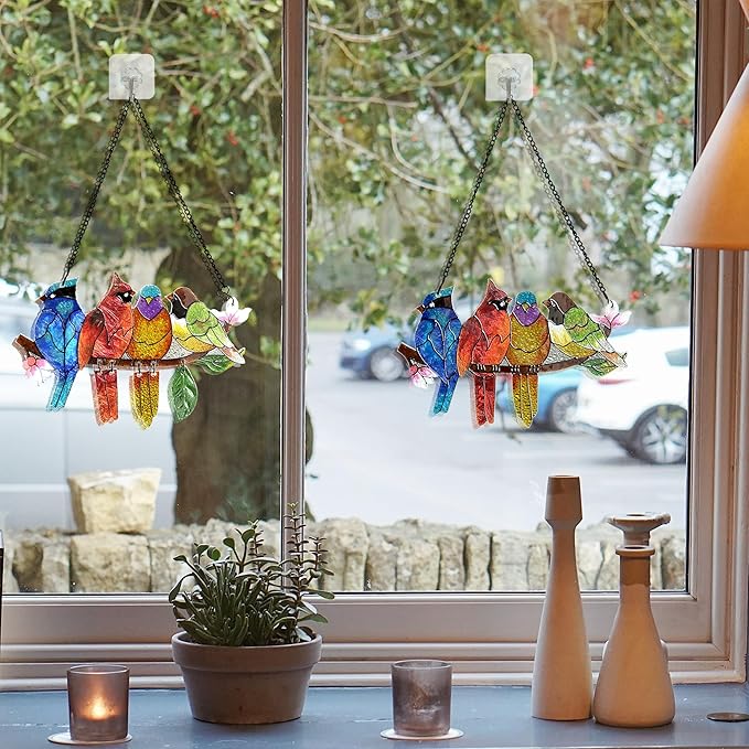 2 Pack Stained Glass Window Hanging - Hummingbird Decorations Suncatcher Hand-Painted Double Sided Birds on A Branch Sun Catcher for Window Home Decor Gifts for Mom,Bird Lovers