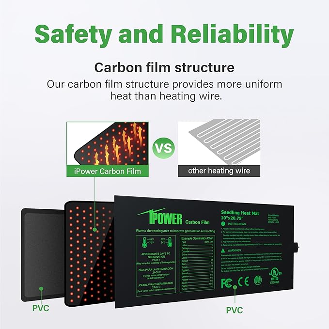 • Reliable heating: the mat is made of upgraded heating film, professionally ensuring uniform heating. The mat warms root area 10-20โ„‰(5-11โ„ƒ) over the ambient air temperature, perfect for seeding and cutting propagation,