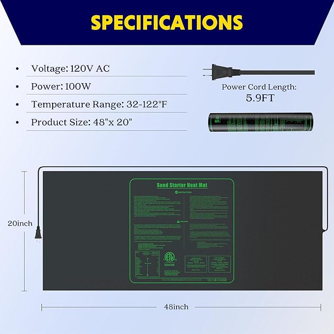 • Heating pad specifications: Size: 48*20 Inch; Wattage: 100W; Voltage: 120V; Material: PVC๏ผ›Protect cold-sensitive plants and improve plant survival rate.