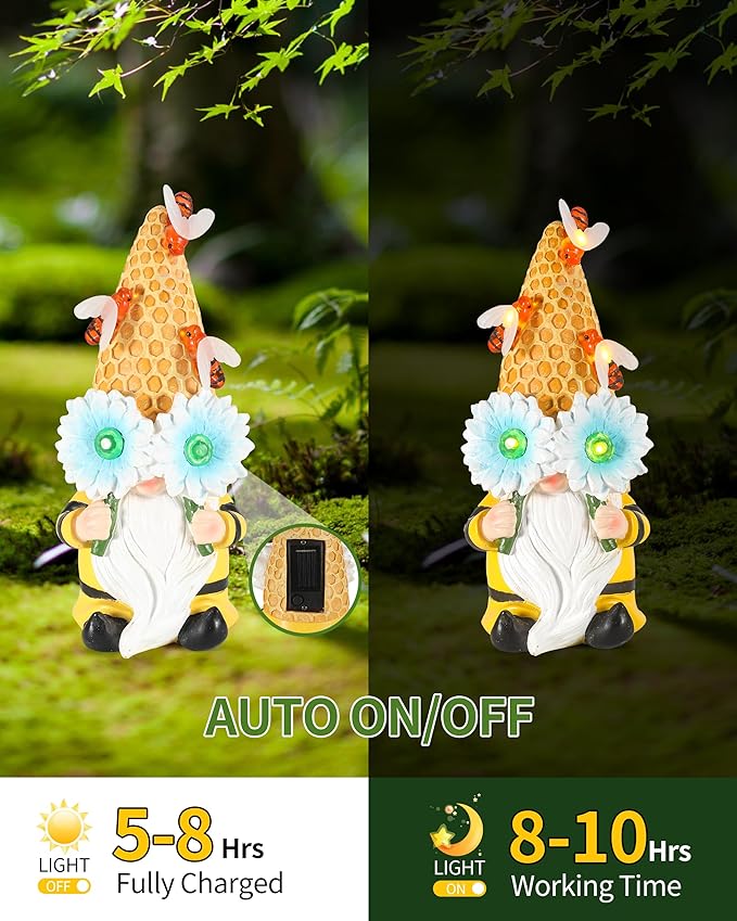 - ๐ Solar-Powered Illumination - Equipped with a built-in solar cell that powers up the bee gnomeโs eyes and delightful bee lights, offering a magical glow during the evening hours.