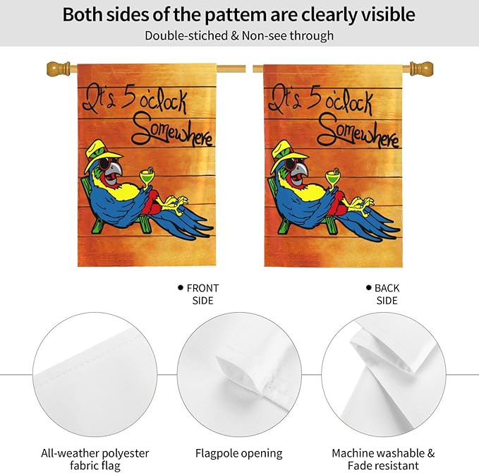• Material: This 5 Oclock Somwhere Garden Flag Is Made Of Polyester, Ensuring Its Durability And Lightweight Design.The Designs And Words Are Double Sided Which Can Be Clearly Viewed From Both Sides.