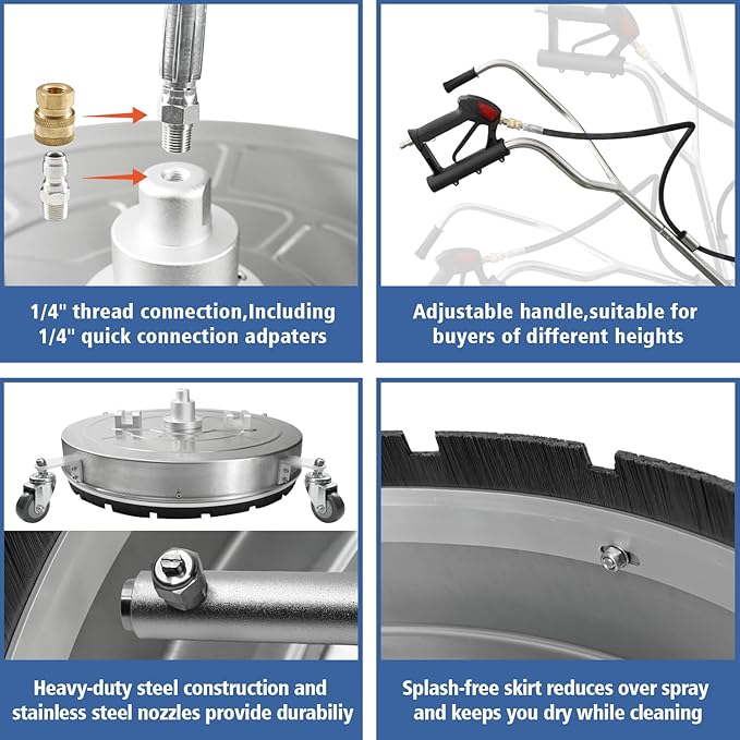 - PREMIUM QUALITY - Constructed with durable stainless-steel material and equipped with a heavy-duty bearing system, this cleaner ensures long-lasting performance. The splash-free skirt effectively minimizes overspray for a dry-cleaning experience. With adjustable dual-handles and 4 castors, it is easy to use and maneuver, saving you effort.