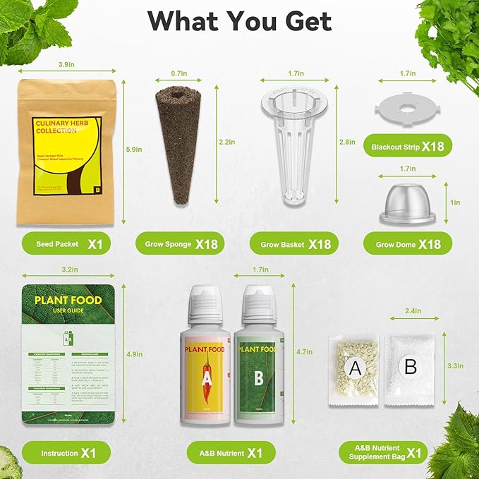 - Variety of Seeds: This herb seed pod kit includes seven types of heirloom seeds—basil, parsley, shiso, liquorice, mint, cilantro, and chicory—along with 18 grow sponges, 18 grow domes, 18 grow baskets, 18 foil stickers, and A&B plant food. Perfectly designed for the Inbloom 12-Pod HydroGarden. With over 350 seeds, you can grow your favorites and enjoy endless indoor gardening fun!