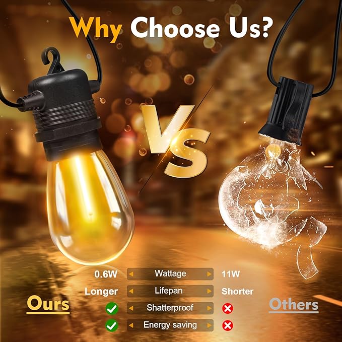 - 【Weatherproof String Lights for Outside】Rain or shine, our S14 string light bulbs shine bright, resilient against rain, wind, and extreme temperatures. Featuring shatterproof bulbs and stable construction, safety is paramount—no more worries about broken glass shards!