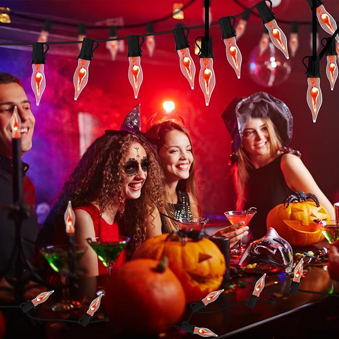 - 🔥【Halloween Clear Flickering Flame String Lights】: 27.8 Feet Halloween Flickering Flame String Light with 29 Clear Glass Flame Bulbs (4 Spare Bulbs), 1 Watt 120 Volt for C7/E12 Screw Base, Black Cord. When the flame bulbs are energized, the flames flicker realistically like dancing fairies, mysterious and charming, adding a charming and fun glow to your Halloween decorations. The flame light can provide 2000+ hours of illumination, safe and durable, no need to change the bulb frequently.