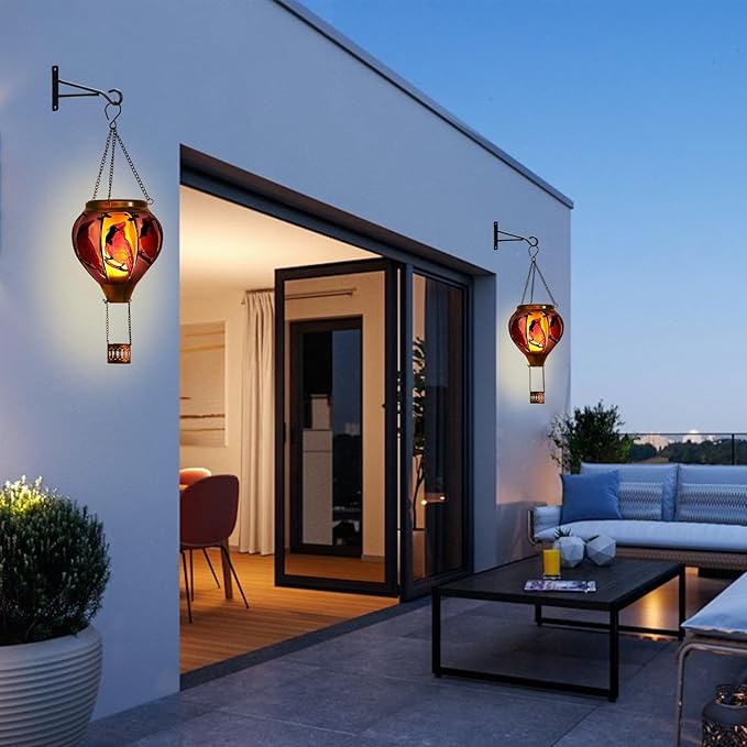 - 【Hot Air Balloon Design】This hot air balloon solar lantern is made of thick glass and a realistic flame lights. When the sun goes down, the flickering flame effect resembles a real hot air balloon, creating an amazing visual effect and adding a great atmosphere to your garden, patio and yard.