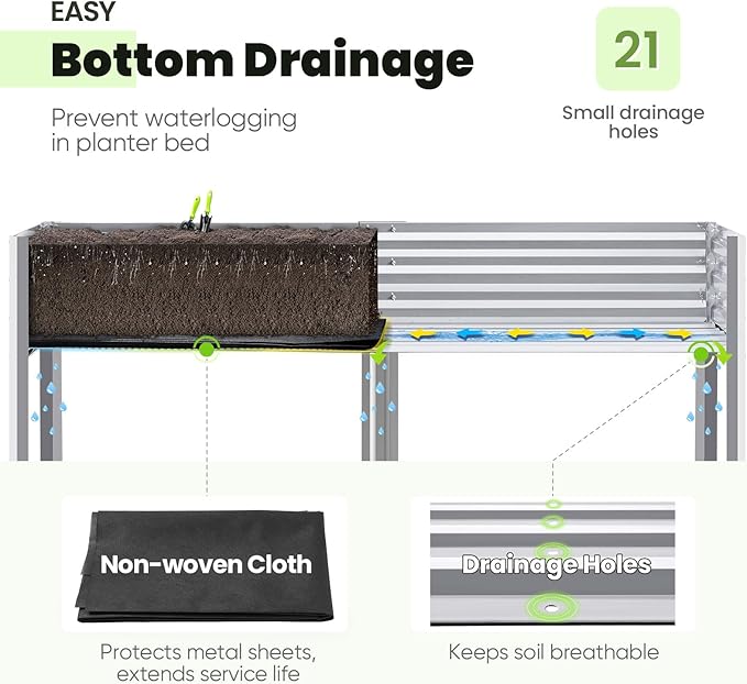 - 【Effortless Drainage】Ample drainage holes allow plant roots to breathe and drain properly. Comes with a non-woven fabric liner to ensure efficient drainage while containing soil, enabling worry-free indoor and outdoor use. The elevated garden bed is ideal for garden, backyard, balcony, and deck.