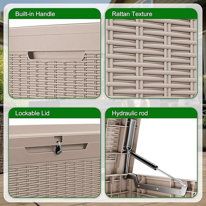 • EASY TO USE: The deck storage box is designed for convenience with built-in handles on both sides, allowing easy lifting and movement. Plus, for added security, you can install a password lock/small lock (not included) on the top cover