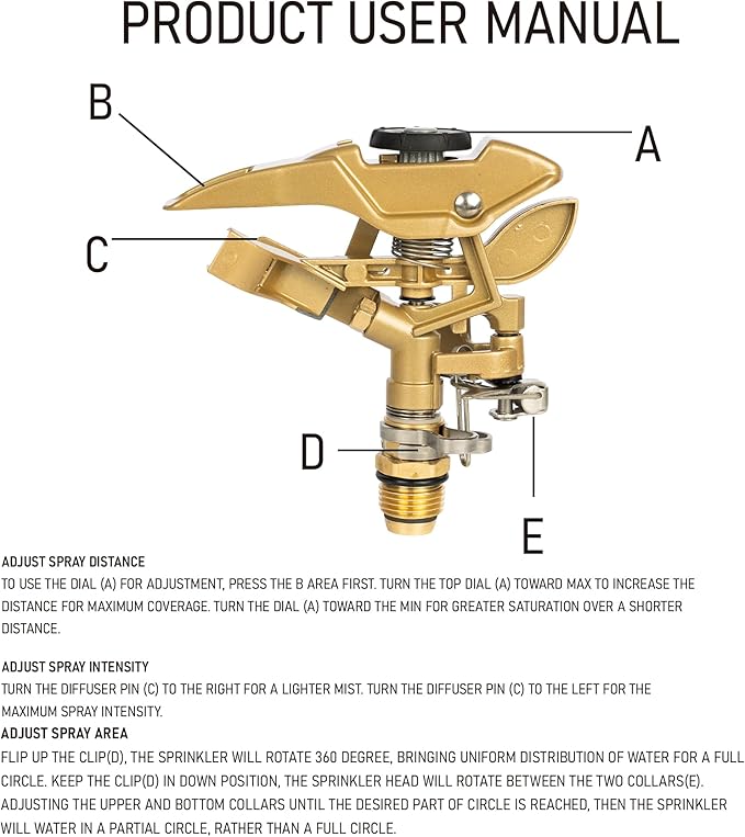 • Adjustable Design: The garden sprinkler features a 0-360 degree adjustable spray pattern. You can customize the spray distance and angle using the adjustment settings on the sprinkler head to meet your specific needs. The black component on the top can adjust the spray distance