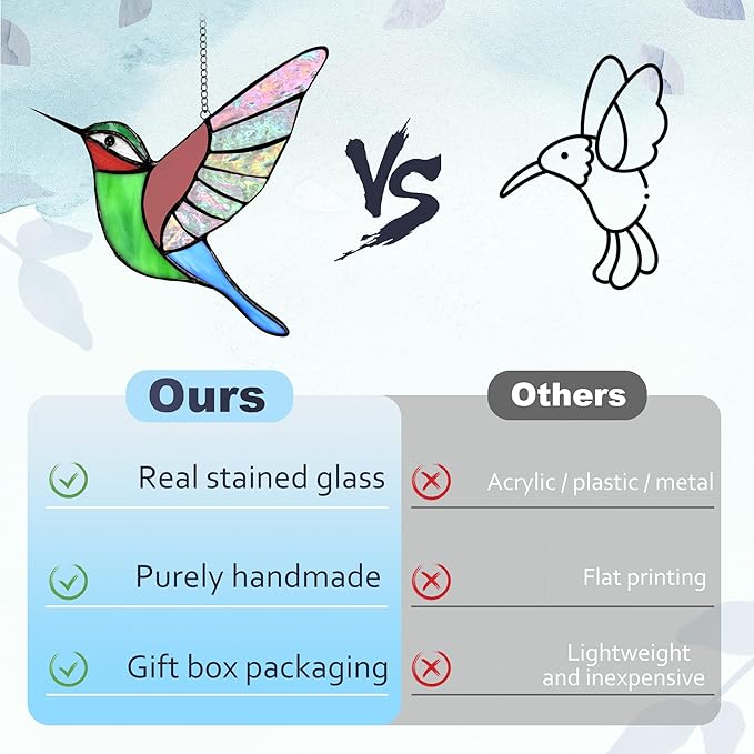 • Safety Protection:The hummingbird stained glass window hanging is packaged independently,placed inside a box,and covered with soft foam to ensure a safe delivery to your hands!If you have any questions about our product,please feel free to contact us at any time