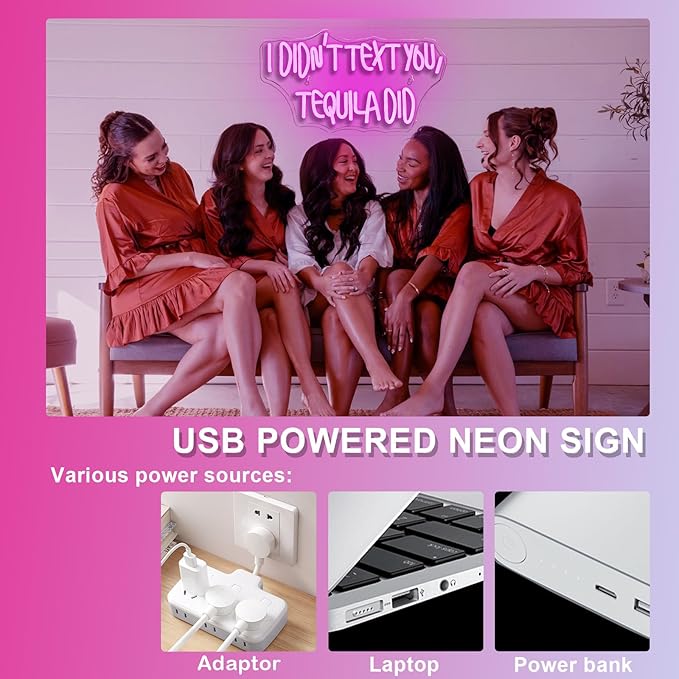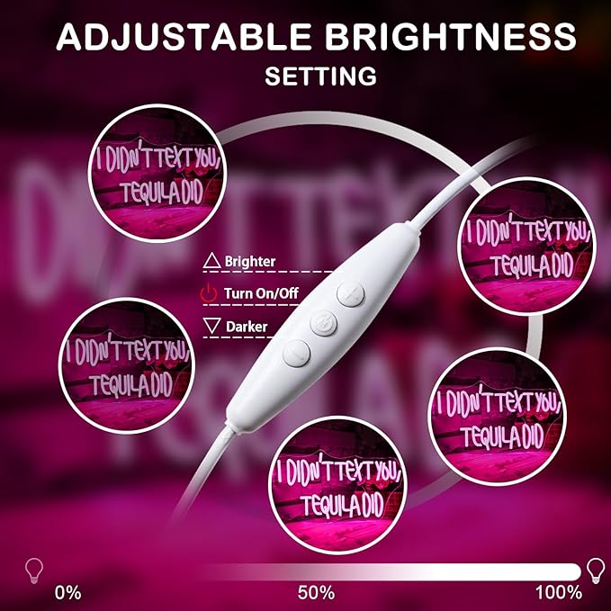 • Adjustable Brightness: Whether creating a romantic dinner atmosphere or a lively party vibe, our "I didn't text you, tequila did" neon sign adds a charming glow to your setting. With its brightness adjustment feature, you can effortlessly control the softness or brightness of the light, making it for any occasion