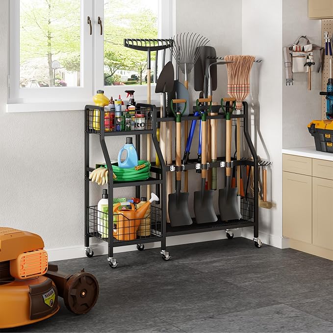 keomaisyto Garden Tool Organizer with 6 Wheels(3 lockable), Heavy Duty Yard Tool organizer with 2 Basket, Large Metal Garage Tool Organization and Storage for Garage/Shed/Yard/Broom Closet/Lawn