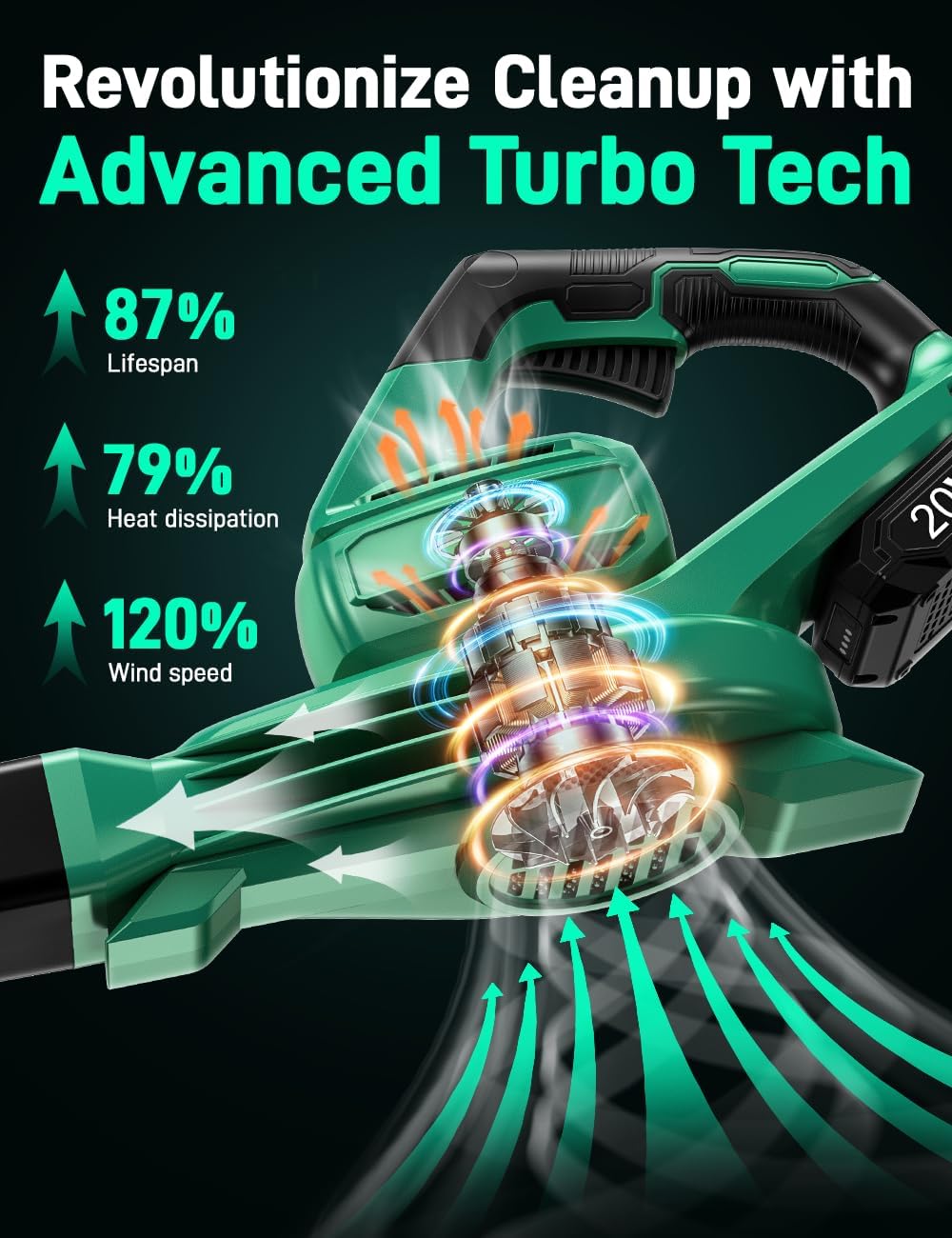 - ๐ใ๐๐ฉ๐ ๐ซ๐๐๐๐ ๐๐ฎ๐ซ๐๐ข๐ง๐ ๐๐๐๐กใThanks to the latest motor and upgraded turbocharging technology of Kimo leaf blower cordless with battery and charger, realizing 170 MPH blowing speed and 240 CFM air volume within this battery operated blower. Enjoy the joy of strong boosting power instantly. Besides, the cellular radiator on the bottom of the rechargeable leaf blower greatly reduces the risk of overheating, providing a more safty and durability for you.