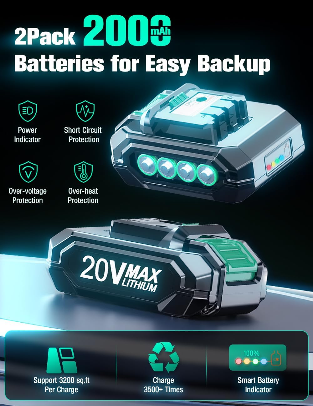 - 🌱【2*2000mAh Batteries with Smart Power Indicator】Two replaceable batteries allow you to switch to a fully charged battery when another battery runs out of power, without waiting for a charge. Also, by alternating between the two batteries, the wear on each battery is reduced, and the battery life can be extended by 150%. The batteries that come with KIMO battery powered leaf blower and lawn trimmers are equipped with a battery indicator light, so you will never be out of power while using them.