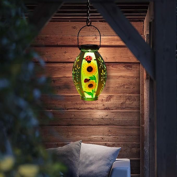 - 【Widely Used】Outdoor solar lanterns comes with a metal handle, so you can hang the glass lantern lamp on your patio, porch, garden, or shepherd hook, or place sunflower solar outdoor lanterns on indoor or outdoor table and floor. The lively sunflower decoration and warm light projection will make it an ideal choice for yard decoration.